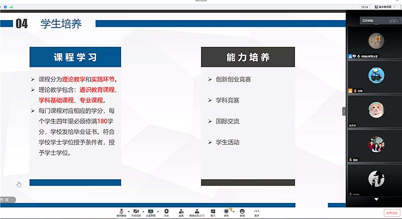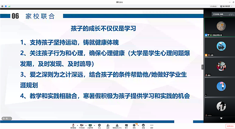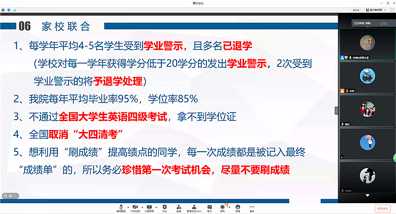 随后,刘婧介绍了学院领导、各专业教师班主任和辅导员。她就学生的学习成绩、毕业问题、考研就业问题等进行了简要说明,加强了家长和学生对学校学院的了解。此外,刘婧特别提醒家长要注意网络诈骗问题,呼吁家长与学院老师保持长效沟通,关注学生的在校活动,促进学生的健康成长。