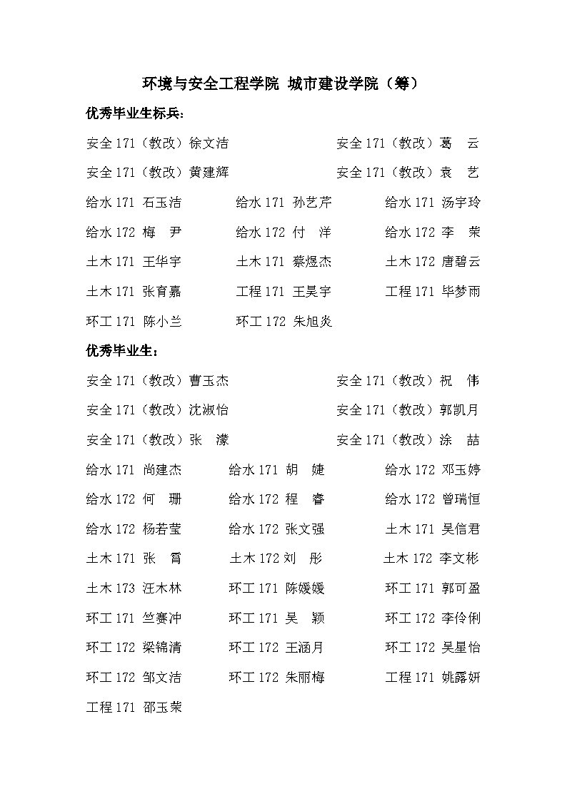 根据《常州大学“优秀毕业生”“优秀毕业生标兵”评比办法》(常大[2015] 102号文件),经学生本人申请,学院学工办初审,报学院党政联席会审定,现将环境u安全工程学院2021届优秀毕业生、优秀毕业生标兵拟推荐名单进行公示。如有不同意见,请于2021年6月15日16:30前以口头或书面形式向环境学院学生工作办公室(常州大学武进校区逸夫楼633)反映,电话0519-86330218。