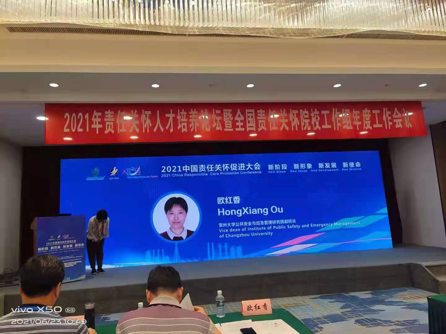 由中国石油和化学工业联合会、国际化学品制造商协会主办的2021中国责任关怀促进大会在南京举行,来自中国石油、中国石化、中国中化、国家能源集团、万华、鲁西、巴斯夫、卡博特、北京大学光华管理学院、南京江北新区新材料科技园等央企、民企、外企、院校、化工园、科技园区的400多名代表参加了这次大会,大会设社区认知和应急响应、过程(工艺)安全、污染防治、化学品安全管理、责任关怀人才培养等论坛。我院欧红香教授在责任关怀人才培养论坛做特邀报告——《基于责任关怀的大学生安全素质教育研究》,报告从大学生面临的风险与挑战、平安中国建设中高校安全素质教育的使命担当入手,分析责任关怀的内涵及其与大学生安全素质教育的联系,探讨分阶段、全培养周期内将责任关怀理念融入大学生安全素质教育过程中,通过多途径的校园安全文化建设增强大学生安全素质,讨论院校责任关怀理念推广思路。论坛上还就2021年责任关怀院校工作组的工作计划进行了交流讨论。