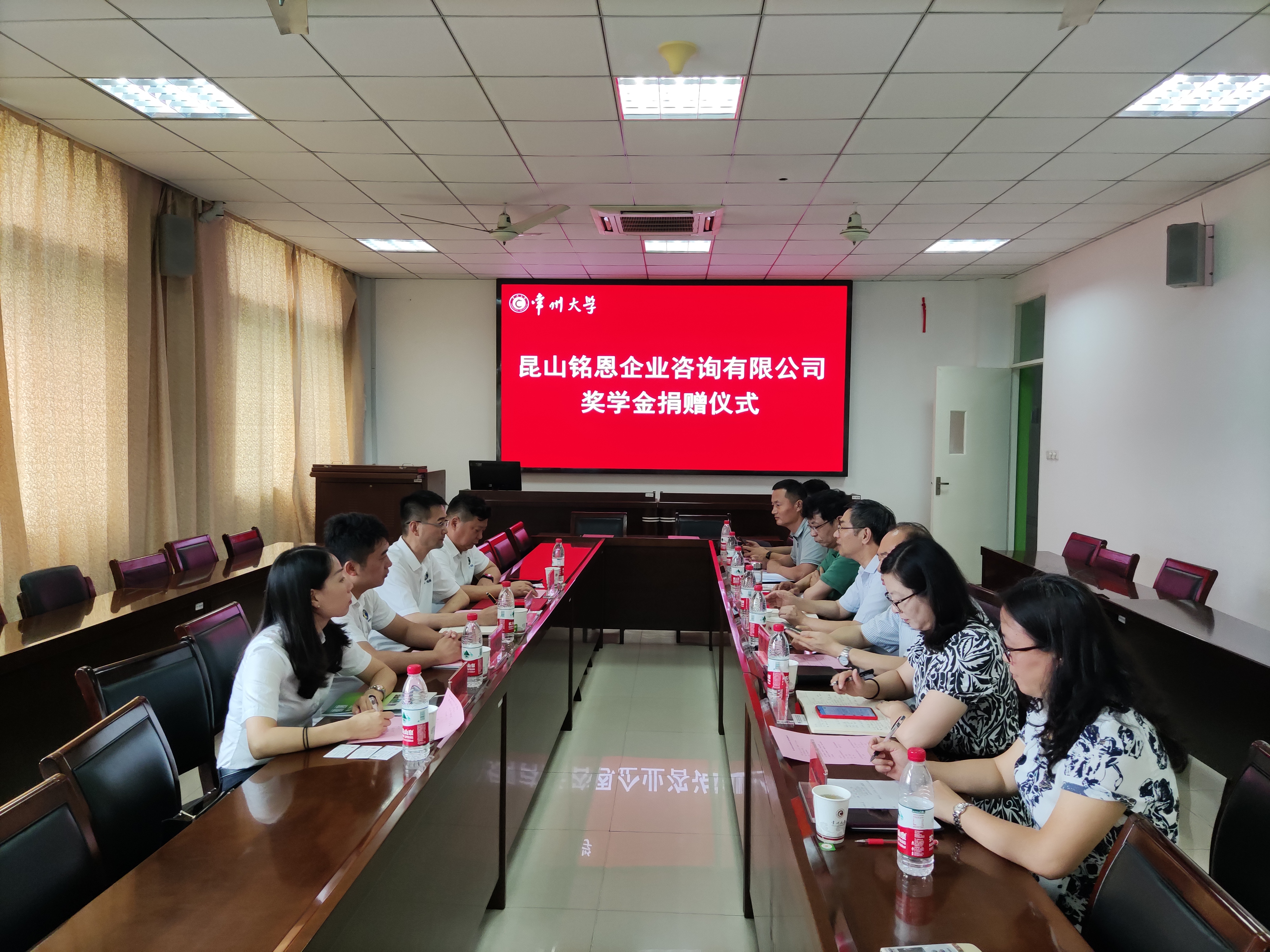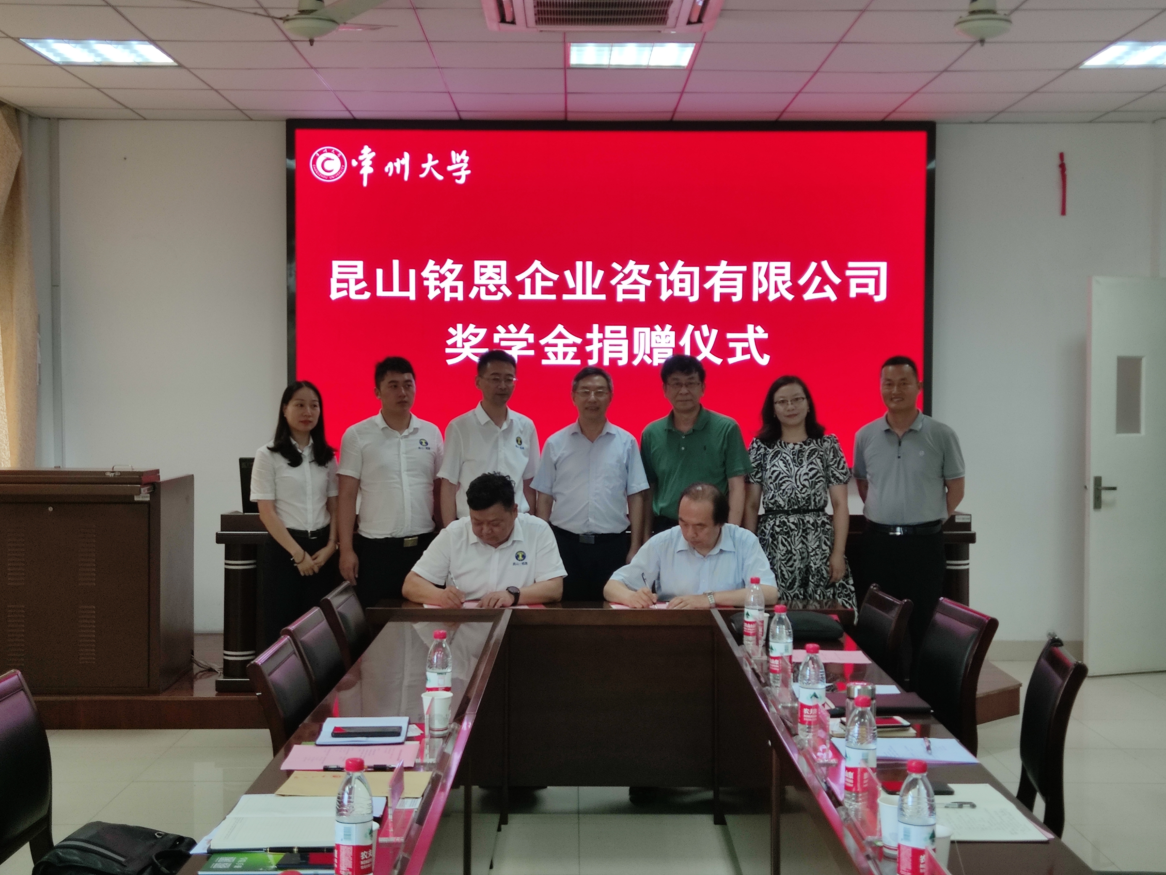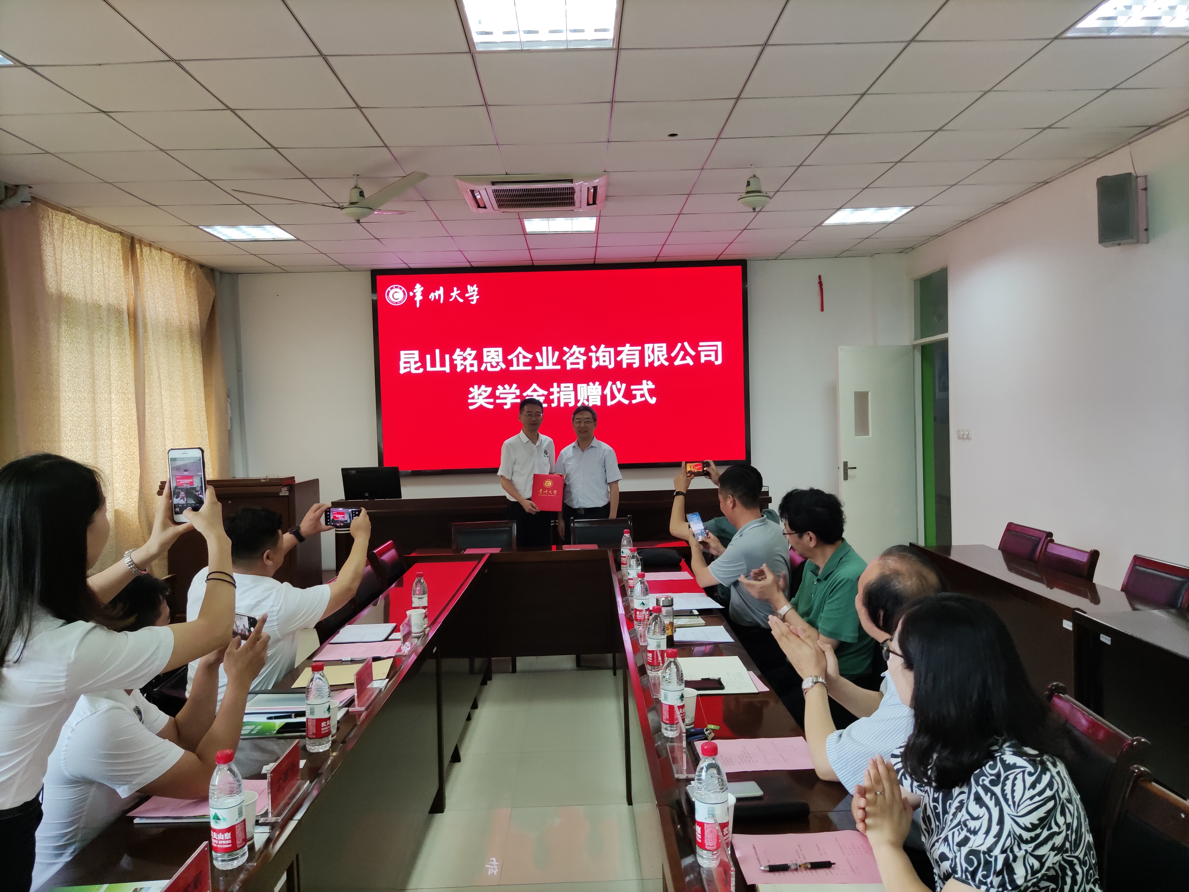 7月2日下午,昆山铭恩企业咨询有限公司奖学金捐赠仪式在明行楼341会议室举行。昆山铭恩企业咨询有限公司张琦云董事长、姚鸣良总经理、丁葛平副总、成丽丽主任,江苏中安联科信息技术有限公司黄涛总经理,常州大学发展规划处浦建民处长,学院薛荣书记、张跃院长、刘婧副书记、冯胜副院长、王新颖院长助理参加捐赠仪式。冯胜副院长主持会议。