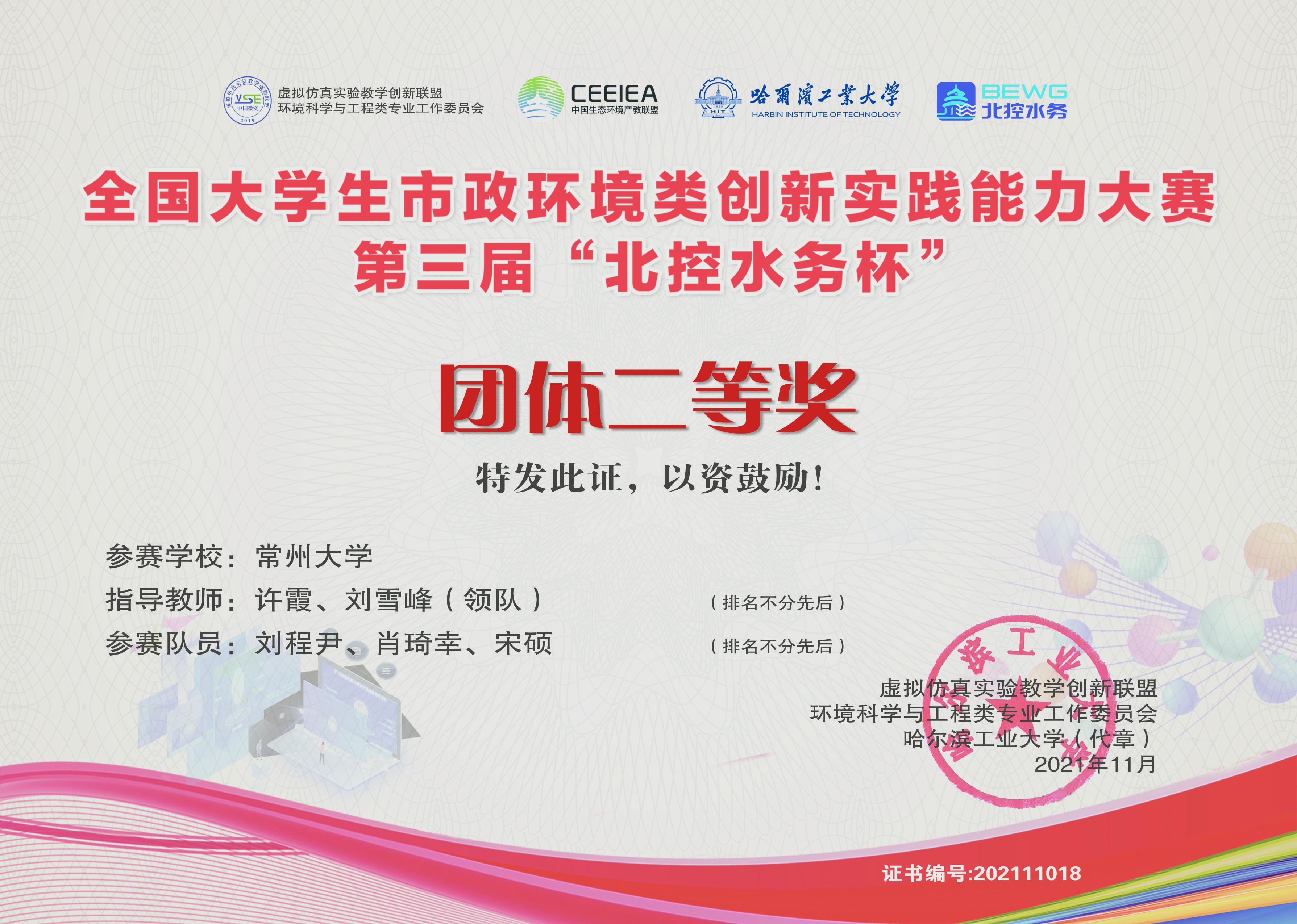 2021年11月27日,由虚拟仿真实验教学创新联盟环境科学与工程类专业工作委员会、生态环境产教联盟和哈尔滨工业大学主办的第三届全国大学生市政环境类创新实践能力大赛决赛在线上举行。由我院2019级给排水科学与工程专业本科生刘程尹、肖琦幸、宋硕组成的队伍荣获团体二等奖,指导教师为许霞、刘雪峰。赛闭幕式暨颁奖仪式于2021年12月1日在哈尔滨工业大学环境学院举行,并在线上同步直播。中国工程院马军院士,哈尔滨工业大学副校长沈毅教授,教育部高等学校给排水科学与工程专业教学指导分委会主任李伟光教授,虚拟仿真实验教学创新联盟秘书长、清华大学江永亨教授分别为获奖选手颁奖。