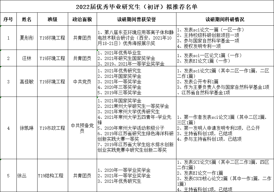根据学校要求,学院开展了2022届常州大学“优秀毕业研究生”预评工作,经学生本人申请、学院研究生奖(助)学金及校内评优表彰评审委员会评审,有以下学生初步符合常州大学“优秀毕业研究生”条件(毕业论文暂未计算在内,最终名单结合毕业论文成绩确定),现予以公示: