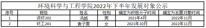 根据我校发展学生党员公示制的有关规定,经环境科学与工程学院各学生党支部讨论决定和环境科学与工程学院党委审议,拟确定下列同志为发展对象。现将基本情况公示如下: