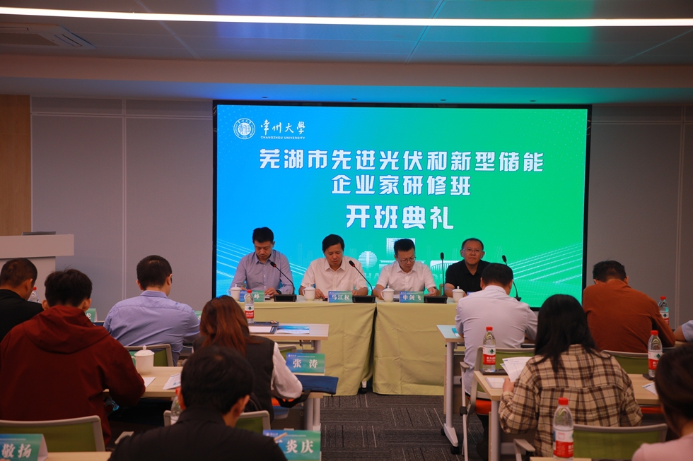 2025 年 10 月 14 日上午,“芜湖市先进光伏和新型储能企业家研修班” 开班仪式在常州大学金坛教育科创园成功举行。芜湖市工业和信息化局党委委员、副局长申剑飞,互联网科科长梅汗青,常州大学环境科学与工程学院党委书记薛峰、院长马江权,继续教育学院副院长彭小建等嘉宾出席仪式,来自芜湖市光伏与储能电池领域的数十位企业高管共同参与本次研修。