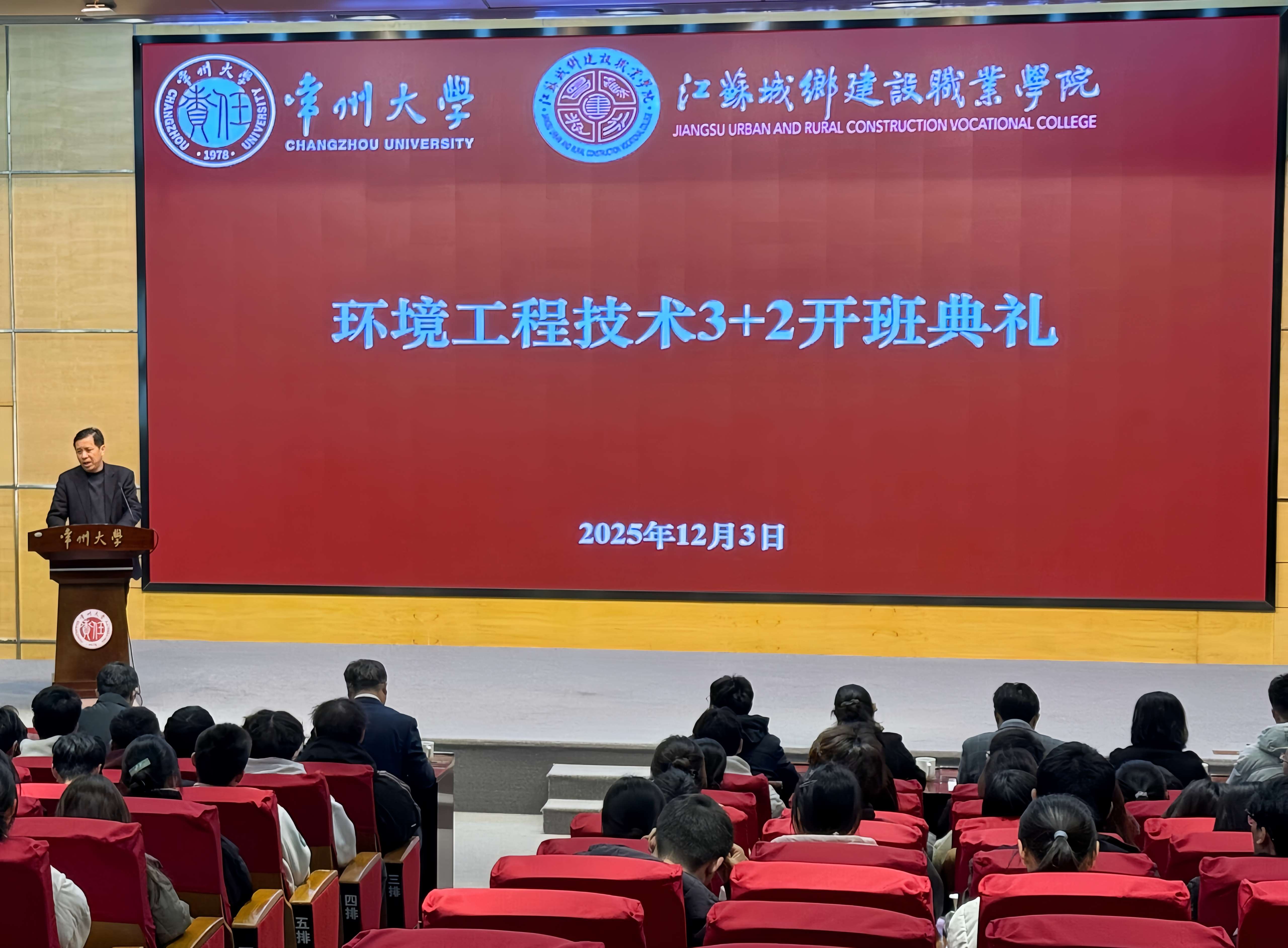 12月3日下午,我校与江苏城乡建设职业学院在文彰楼报告厅举行环境工程技术专业“3+2”专本贯通项目开班典礼。我校党委常委、副校长李忠玉,江苏城乡建设职业学院党委委员、副校长袁建刚出席活动,两校相关学院、职能部门负责人、教师代表及江苏城乡建设职业学院环境2301、2401、2501三个班级全体学生共同参加。我校环境科学与工程学院院长马江权主持活动。
