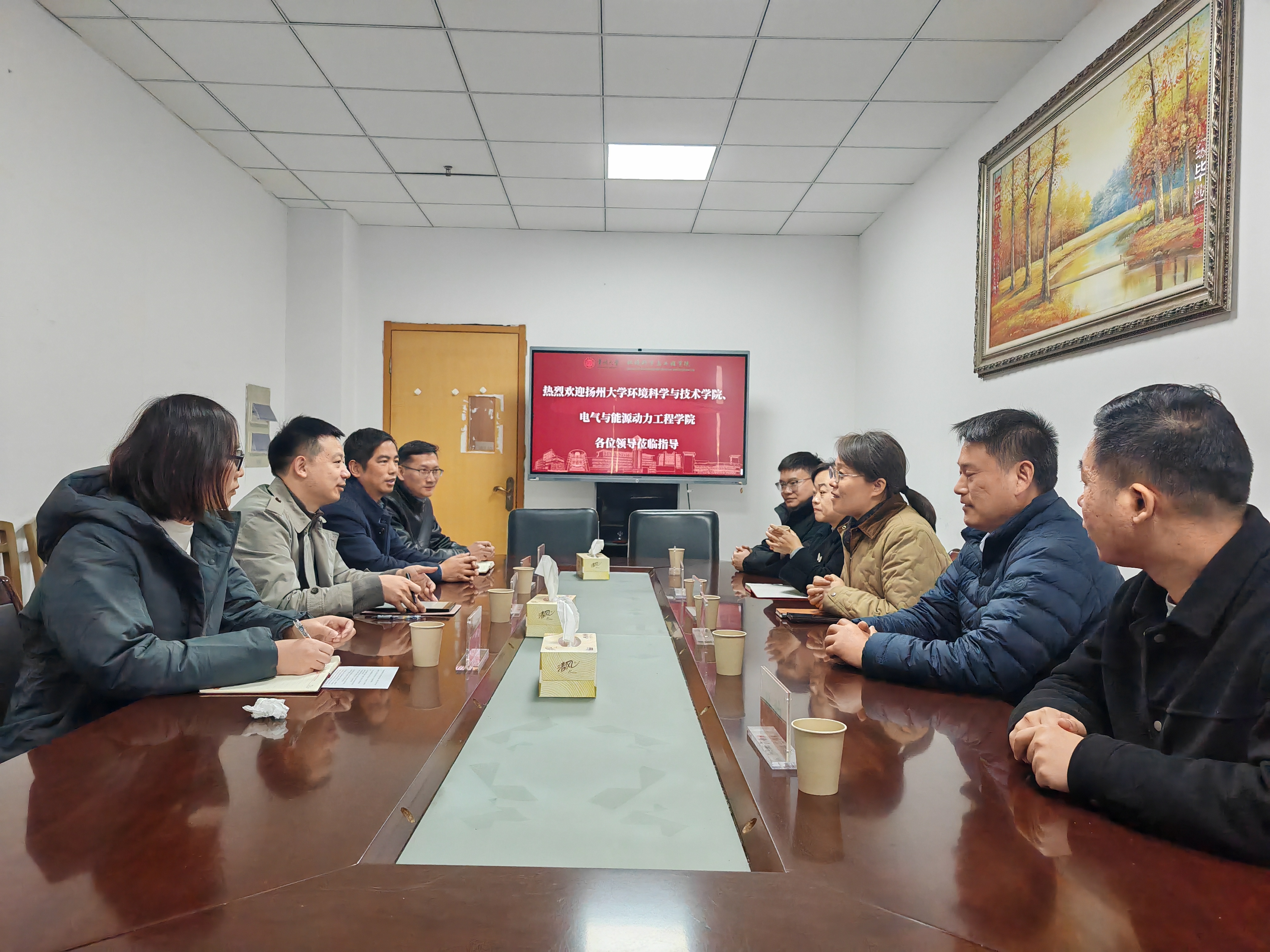 2025年12月16日,扬州大学环境科学与技术学院党委书记陈春霞、党委副书记李玉军,电气与能源动力工程学院党委副书记周敏及辅导员陆帅、孙子明一行莅临我院调研交流。我院党委书记薛峰、学生处副处长陆先亮、副书记林凌敏、及辅导员周蓓蓓参加座谈。双方围绕党建引领、学科建设、思政育人等核心议题展开深度对话。