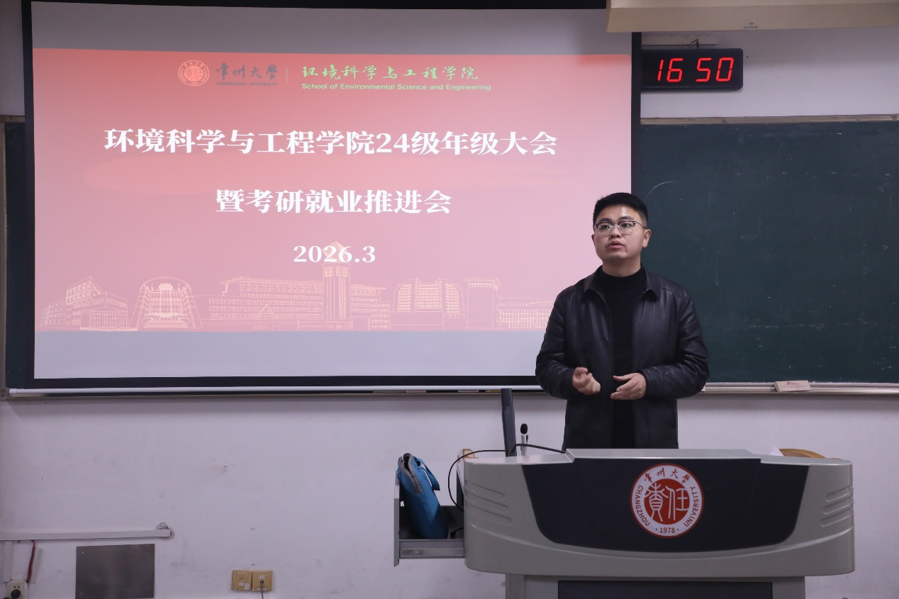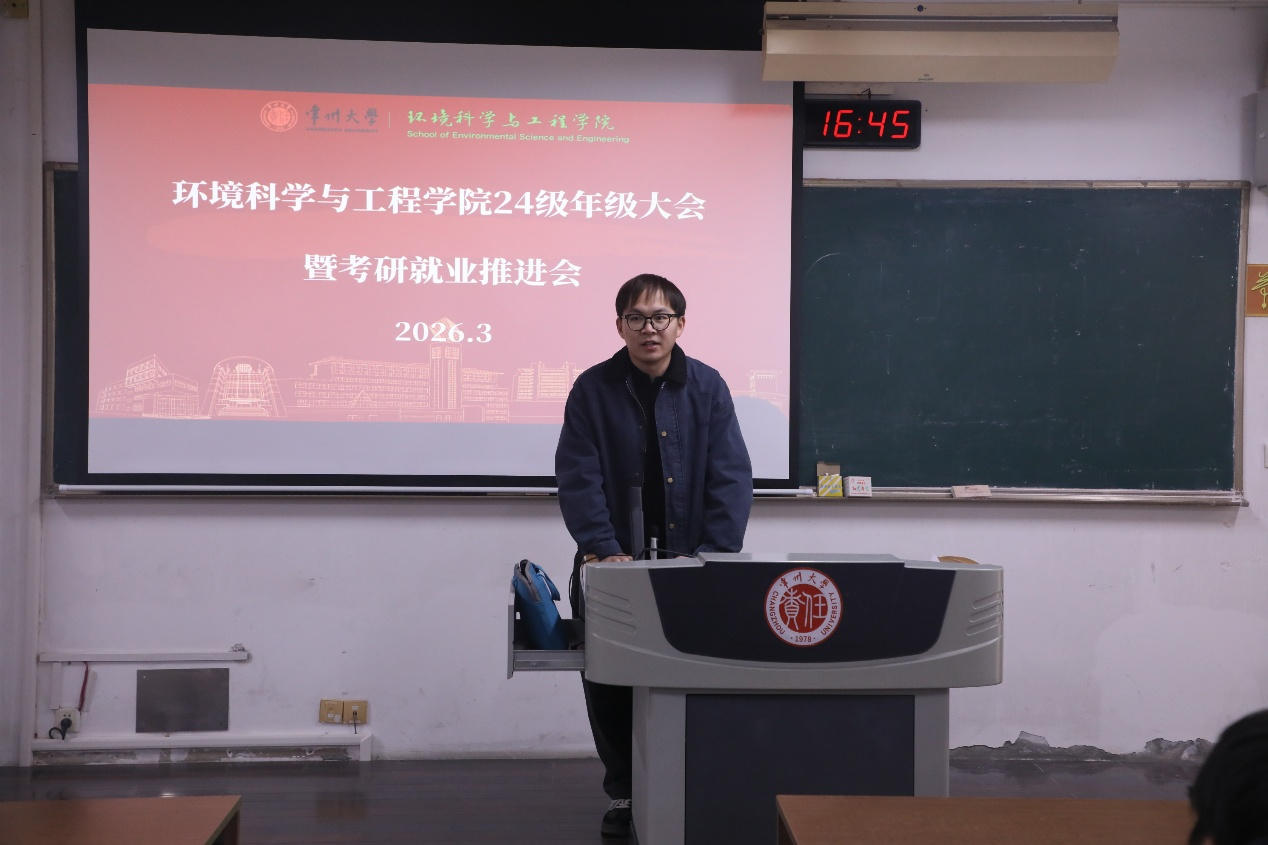 为明确24级学生考研与就业方向,精准把握备考节奏,2026年3月9日,环境科学与工程学院在W2105召开24级年级大会暨考研就业推进会,学院辅导员戴鸣轩及全体24级学生参与会议。