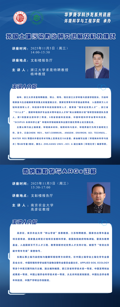 【学术报告预告】浙江大学杨坤教授、南京农业大学高彦征教授学术报告